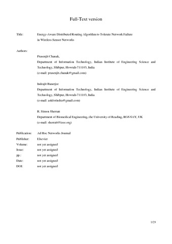 Energy-aware distributed routing algorithm to tolerate network failure in wireless sensor networks.