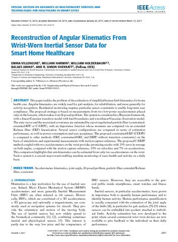 Reconstruction of angular kinematics from wrist-worn inertial sensor data for smart home healthcare.