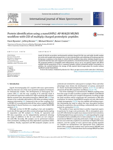 Protein identification using a nanoUHPLC-AP-MALDI MS/MS workflow with CID of multiply charged proteolytic peptides.
