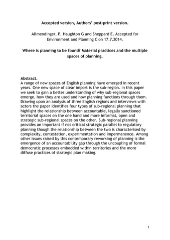 A range of new spaces of English planning have emerged in recent years. One new space of clear import is the sub-region. In this paper we seek to gain a better understanding of why sub-regional spaces emerge, how they are used and how planning functions through them. Drawing upon an analysis of three English regions and interviews with actors the paper identifies four types of sub-regional planning that highlight the relationship between accountable, legally sanctioned territorial spaces on the one hand and more informal, open and strategic sub-regional spaces on the other. Sub-regional planning provides an important if not critical strategic parallel to regulatory planning though the relationship between the two is characterised by complexity, contestation, experimentation and impermanence. Among other issues raised by this contemporary reworking of planning is the emergence of an accountability gap through the uncoupling of formal democratic processes embedded within territories and the more diffuse practices of strategic plan making.