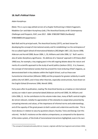 Although Bull is often identified as a theorist of international society, this volume has shown that there is more to The Anarchical Society than international society, narrowly construed. The contemporary relevance of Bull’s work is clearest when we recognize the flexibility of his conceptual framework and, in particular, the often overlooked potential of his concept of the ‘world political system’ of which modern international society is only a part. It is also helpful to recognize the provisional nature of Bull’s intellectual priorities and of his empirical and evaluative judgements. Bull’s argument that international society provides the surest route to world order reflected his judgement at ‘present’ and we can revise it today without doing violence to his intellectual project. This concluding chapter highlights the flexibility of Bull’s approach and the provisional nature of his judgements while also reviewing the limits of this flexibility and identifying possible future directions of inquiry.