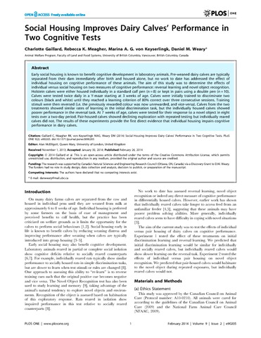 Gaillard, C., Meagher, R. K., von Keyserlingk, M. A. G. and Weary, D. M. (2014) Social housing improves dairy calves' performance in two cognitive tests. PLoS ONE, 9 (2). e90205. ISSN 1932-6203 doi: 10.1371/journal.pone.0090205