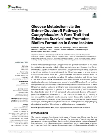 Vegge, C. S., Jansen van Rensburg, M. J., Rasmussen, J. J., Maiden, M. C. J., Johnsen, L. G., Danielsen, M., MacIntyre, S., Ingmer, H. and Kelly, D. J. (2016) Glucose metabolism via the Entner-Doudoroff pathway in Campylobacter: a rare trait that enhances survival and promotes biofilm formation in some isolates. Frontiers in Microbiology, 7. 01877. ISSN 1664-302X doi: 10.3389/fmicb.2016.01877