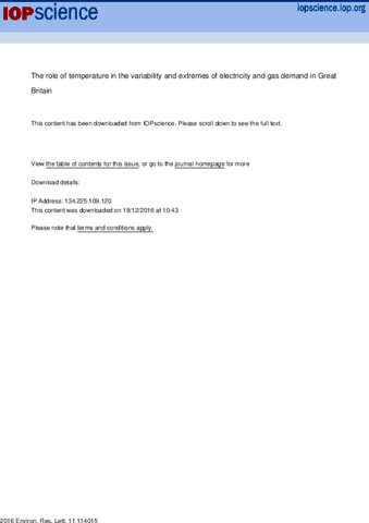 Thornton, H. E., Hoskins, B. J. and Scaife, A. A. (2016) The role of temperature in the variability and extremes of electricity and gas demand in Great Britain. Environmental Research Letters, 11 (11). 114015. ISSN 1748-9326 doi: 10.1088/1748-9326/11/11/114015