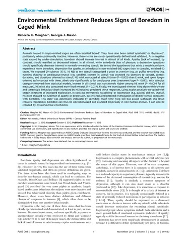 Meagher, R. K. and Mason, G. J. (2012) Environmental enrichment reduces signs of boredom in caged mink. PLoS ONE, 7 (11). e49180. ISSN 1932-6203 doi: 10.1371/journal.pone.0049180