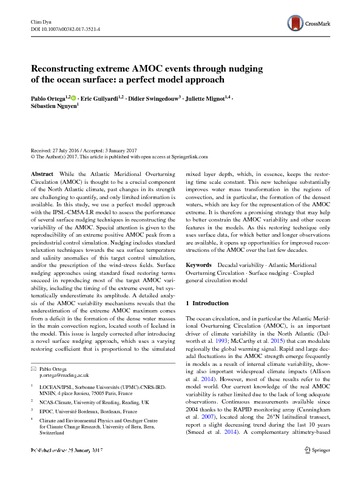 Ortega, P., Guilyardi, E. orcid id iconORCID: https://orcid.org/0000-0002-2255-8625, Swingedouw, D., Mignot, J. and Nguyen, S. (2017) Reconstructing extreme AMOC events through nudging of the ocean surface: a perfect model approach. Climate Dynamics, 49 (9-10). pp. 3425-3441. ISSN 0930-7575 doi: 10.1007/s00382-017-3521-4