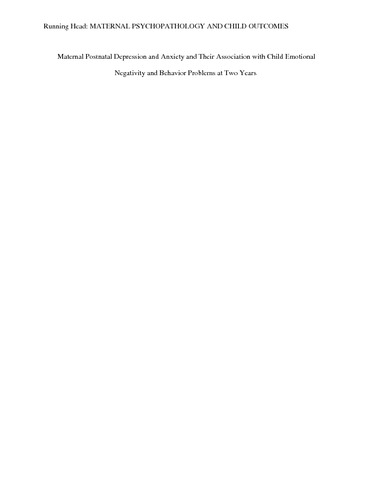 Prenoveau, J. M., Craske, M. G., West, V., Giannakakis, A., Zioga, M., Lehtonen, A., Davies, B., Netsi, E., Cardy, J., Cooper, P., Murray, L. and Stein, A. (2017) Maternal postnatal depression and anxiety and their association with child emotional negativity and behavior problems at two years. Developmental Psychology, 53 (1). pp. 50-62. ISSN 0012-1649 doi: 10.1037/dev0000221