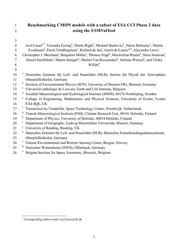 Lauer, A., Eyring, V., Righi, M., Buchwitz, M., Defourny, P., Evaldsson, M., Friedlingstein, P., de Jeu, R., de Leeuw, G., Loew, A., Merchant, C. J. ORCID: https://orcid.org/0000-0003-4687-9850, Müller, B., Popp, T., Reuter, M., Sandven, S., Senftleben, D., Stengel, M., van Roozendael, M., Wenzel, S. and Willen, U.