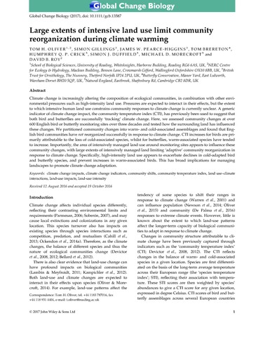 Oliver, T. H. orcid id iconORCID: https://orcid.org/0000-0002-4169-7313, Gillings, S., Pearce-Higgins, J. W., Brereton, T., Crick, H. Q. P., Duffield, S. J., Morecroft, M. D. and Roy, D. B. (2017) Large extents of intensive land use limit community reorganization during climate warming. Global Change Biology, 23 (6). pp. 2272-2283. ISSN 1365-2486 doi: 10.1111/gcb.13587