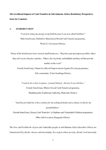 Cash transfers (CTs) are a social protection mechanism to reduce the poorest households’ vulnerability to shocks and build human capital by smoothing consumption and sustaining expenditure on education and social welfare. Our study examines whether and how CTs go beyond welfare objectives to promote livelihoods. Presenting a cross-case analysis using original qualitative data on beneficiary perspectives from six African countries - Kenya, Ethiopia, Malawi, Lesotho, Zimbabwe and Ghana – we explore CT livelihood impacts within household economies and social networks, paying attention to gender issues. We find that a small but predictable flow of cash improves strategic livelihood choices and stimulates productive investments, including through positive effects on beneficiary entry into risk-sharing arrangements and networks for economic collaboration. Levels of household vulnerability and labour constraint nevertheless significantly mediate the ability of CTs to consolidate present livelihood outcomes. The varying availability of economic opportunities and effective programme implementation also shape livelihood impact. Incorporating beneficiary perspectives brings to the fore the multi-dimensionality of CT effects on experiences of poverty and deprivation, including gender dynamics and intangibles such as dignity and respect; they add powerful realism to the influence of the CT on both immediate survival and livelihood choices. Beyond this, they confirm wider knowledge on productive impact and bring nuance to the conditions under which, and mechanisms by which beneficiaries’ use CTs to build productive capability and assets and to make strategic livelihood choices.