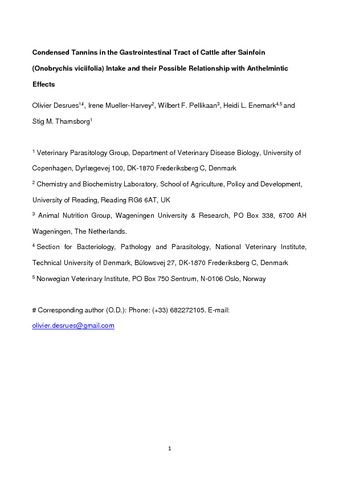 Desrues, O., Mueller-Harvey, I., Pellikaan, W. F., Enemark, H. L. and Thamsborg, S. M. (2017) Condensed tannins in the gastrointestinal tract of cattle after sainfoin (Onobrychis viciifolia) intake and their possible relationship with anthelmintic effects. Journal of Agricultural and Food Chemistry, 65 (7). pp. 1420-1427. ISSN 0021-8561 doi: 10.1021/acs.jafc.6b05830