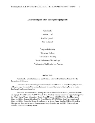 Ikeda, K., Yue, C., L., Murayama, K. and Castel, A., D. (2016) Achievement goals affect metacognitive judgments. Motivation Science, 2 (4). pp. 199-219. ISSN 2333-8121 doi: 10.1037/mot0000047