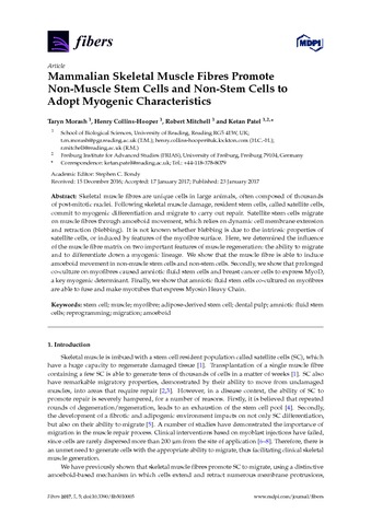 Morash, T., Henry, C.-H., Mitchell, R. and Patel, K. (2017) Mammalian skeletal muscle fibres promote non-muscle stem cells and non-stem cells to adopt myogenic characteristics. Fibers, 5 (1). 5. ISSN 2079-6439 doi: 10.3390/fib5010005