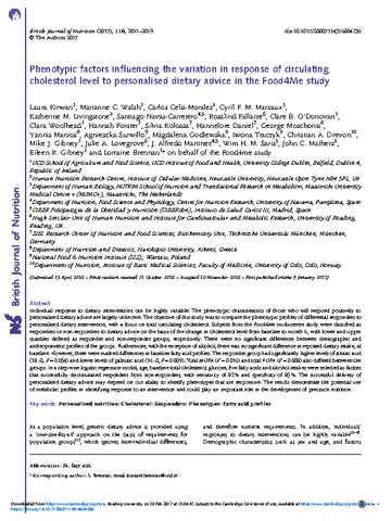 Phenotypic factors influencing the variation in response of circulating cholesterol level to personalised dietary advice in the Food4Me study