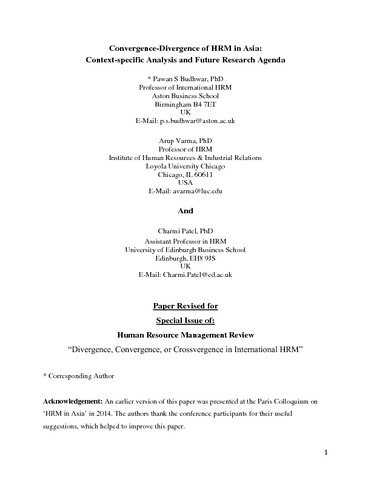 Budhwar, P. S., Varma, A. and Patel, C. (2016) Convergence-divergence of HRM in the Asia-Pacific: context-specific analysis and future research agenda. Human Resource Management Review, 26 (4). pp. 311-326. ISSN 1053-4822 doi: 10.1016/j.hrmr.2016.04.004