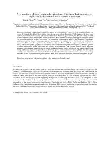 Woldu, H. G., Patel, C. and Crawshaw, J. R. (2013) A comparative analysis of cultural value orientations of Polish and Turkish employees: implications for international human resource management. The International Journal of Human Resource Management, 24 (12). pp. 2452-2471. ISSN 1466-4399 doi: 10.1080/09585192.2013.781430