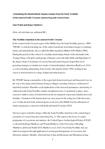 Walsh, S. and Matthews, R. orcid id iconORCID: https://orcid.org/0000-0002-8316-4312 (2018) Articulating the disarticulated: human remains from the Early Neolithic of the eastern Fertile Crescent (eastern Iraq and western Iran). In: Bickle, P. and Sibbeson, E. (eds.) Neolithic Bodies. Neolithic Studies Group Seminar Papers (15). Oxbow Books, Oxford. ISBN 9781785709012