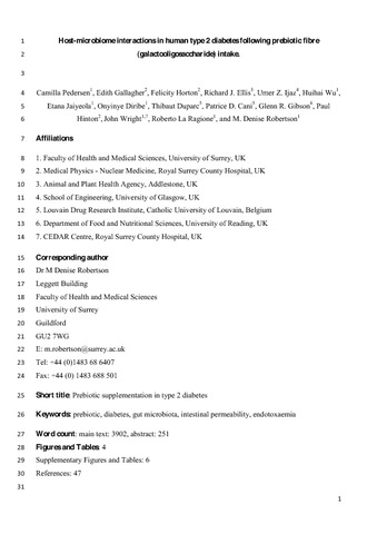 Pedersen, C., Gallgher, E., Horton, F., Ellis, R. J., Ijaz, U. Z., Wu, H., Jaiyeola, E., Diribe, O., Duparc, T., Cani, P. D., Gibson, G. R. orcid id iconORCID: https://orcid.org/0000-0002-0566-0476, Hinton, P., Wright, J., La Ragione, R. and Robertson, M. D. (2016) Host-microbiome interactionsin human type 2 diabetes following prebiotic fibre (galactooligosaccharide) intake. British Journal of Nutrition, 116 (11). pp. 1869-1877. ISSN 0007-1145 doi: 10.1017/S0007114516004086