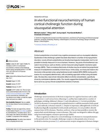 Lindner, M., Bell, T., Iqbal, S., Mullins, P. G. and Christakou, A. orcid id iconORCID: https://orcid.org/0000-0002-4267-3436 (2017) In vivo functional neurochemistry of human cortical cholinergic function during visuospatial attention. PLoS ONE, 12 (2). e0171338. ISSN 1932-6203 doi: 10.1371/journal.pone.0171338