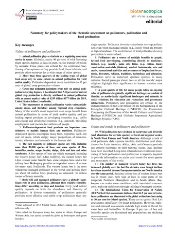 Editorial: summary for policymakers of the thematic assessment on pollinators, pollination and food production.