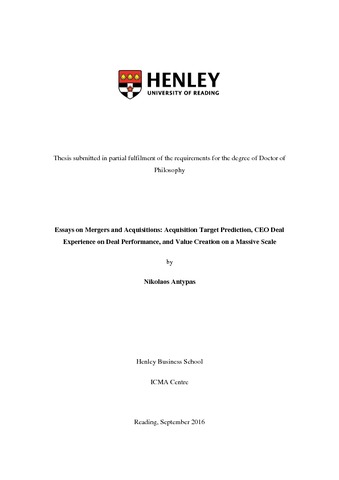 Essays on mergers and acquisitions: acquisition target prediction, CEO deal experience on deal performance, and value creation on a massive scale.