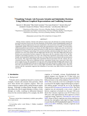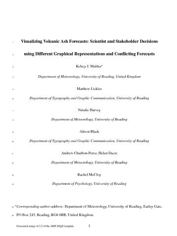 Mulder, K. J., Lickiss, M., Harvey, N. orcid id iconORCID: https://orcid.org/0000-0003-0973-5794, Black, A., Charlton-Perez, A. orcid id iconORCID: https://orcid.org/0000-0001-8179-6220, Dacre, H. orcid id iconORCID: https://orcid.org/0000-0003-4328-9126 and McCloy, R. orcid id iconORCID: https://orcid.org/0000-0003-2333-9640 (2017) Visualizing volcanic ash forecasts: scientist and stakeholder decisions using different graphical representations and conflicting forecasts. Weather, Climate and Society, 9 (3). pp. 333-348. ISSN 1948-8327 doi: 10.1175/WCAS-D-16-0062.1