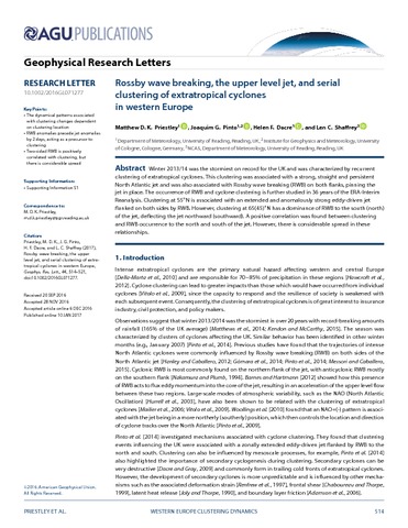 Priestley, M. D. K., Pinto, J. G., Dacre, H. F. orcid id iconORCID: https://orcid.org/0000-0003-4328-9126 and Shaffrey, L. C. orcid id iconORCID: https://orcid.org/0000-0003-2696-752X (2017) Rossby wave breaking, the upper level jet, and serial clustering of extratropical cyclones in western Europe. Geophysical Research Letters, 44 (1). pp. 514-521. ISSN 0094-8276 doi: 10.1002/2016GL071277