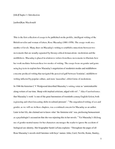 Macdonald, K. (2017) Introduction. In: Macdonald, K. (ed.) Rose Macaulay, Gender, and Modernity. Routledge, London and New York, pp. 1-34. ISBN 9781138206175