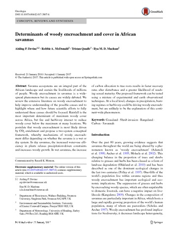 Savanna ecosystems are an integral part of the African landscape and sustain the livelihoods of millions of people. Woody encroachment in savannas is a widespread phenomenon but its causes are widely debated. We review the extensive literature on woody encroachment to help improve understanding of the possible causes and to highlight where and how future scientific efforts to fully understand these causes should be focused. Rainfall is the most important determinant of maximum woody cover across Africa, but fire and herbivory interact to reduce woody cover below the maximum at many locations. We postulate that woody encroachment is most likely driven by CO2 enrichment and propose a two-system conceptual framework, whereby mechanisms of woody encroachment differ depending on whether the savanna is a wet or dry system. In dry savannas, the increased water-use efficiency in plants relaxes precipitation-driven constraints and increases woody growth. In wet savannas, the increase of carbon allocation to tree roots results in faster recovery rates after disturbance and a greater likelihood of reaching sexual maturity. Our proposed framework can be tested using a mixture of experimental and earth observational techniques. At a local level, changes in precipitation, burning regimes or herbivory could be driving woody encroachment, but are unlikely to be the explanation of this continent-wide phenomenon.