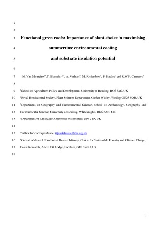 Vaz Monteiro, M., Blanusa, T., Verhoef, A. orcid id iconORCID: https://orcid.org/0000-0002-9498-6696, Richardson, M., Hadley, P. and Cameron, R. W. F. (2017) Functional green roofs: importance of plant choice in maximising summertime environmental cooling and substrate insulation potential. Energy and Buildings, 141. pp. 56-68. ISSN 0378-7788 doi: 10.1016/j.enbuild.2017.02.011