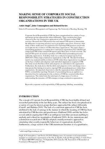 Making sense of corporate social responsibility strategies in construction organisations in the UK.