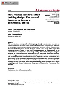 Faulconbridge, J., Cass, N. and Connaughton, J. orcid id iconORCID: https://orcid.org/0000-0002-8878-8589 (2018) How market standards affect building design: the case of low energy design in commercial offices. Environment and Planning A, 50 (3). pp. 627-650. ISSN 1472-3409 doi: 10.1177/0308518x17752681