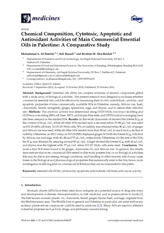 Al-Tamimi, M. A., Rastall, B. and Abu-Reidah, I. M. (2016) Chemical composition, cytotoxic, apoptotic and antioxidant activities of main commercial essential oils in Palestine: a comparative study. Medicines, 3 (4). 27. ISSN 2305-6320 doi: 10.3390/medicines3040027