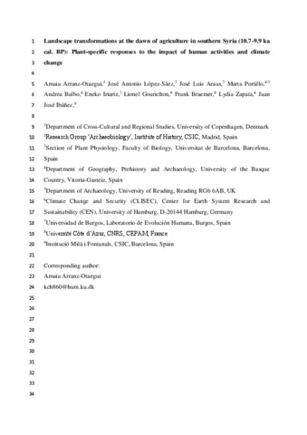 Arranz-Otaegui, A., López-Sáez, J. A., Araus, J. L., Portillo, M., Balbo, A., Iriarte, E., Gourichon, L., Braemer, F., Zapata, L. and Ibáñez, J. J. (2017) Landscape transformations at the dawn of agriculture in southern Syria (10.7–9.9 ka cal. BP): plant-specific responses to the impact of human activities and climate change. Quaternary Science Reviews, 158. pp. 145-163. ISSN 02773791 doi: 10.1016/j.quascirev.2017.01.001