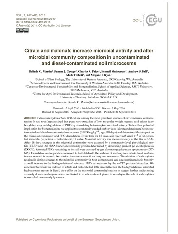 Petroleum hydrocarbons (PHCs) are among the most prevalent sources of environmental contamination. It has been hypothesized that plant root exudation of low molecular weight organic acid anions (carboxylates) may aid degradation of PHCs by stimulating heterotrophic microbial activity. To test their potential implication for bioremediation, we applied two commonly exuded carboxylates (citrate and malonate) to uncontaminated and diesel-contaminated microcosms (10 000 mg kg−1; aged 40 days) and determined their impact on the microbial community and PHC degradation. Every 48 h for 18 days, soil received 5 µmol g−1 of (i) citrate, (ii) malonate, (iii) citrate + malonate or (iv) water. Microbial activity was measured daily as the flux of CO2. After 18 days, changes in the microbial community were assessed by a community-level physiological profile (CLPP) and 16S rRNA bacterial community profiles determined by denaturing gradient gel electrophoresis (DGGE). Saturated PHCs remaining in the soil were assessed by gas chromatography–mass spectrometry (GC-MS). Cumulative soil respiration increased 4- to 6-fold with the addition of carboxylates, while diesel contamination resulted in a small, but similar, increase across all carboxylate treatments. The addition of carboxylates resulted in distinct changes to the microbial community in both contaminated and uncontaminated soils but only a small increase in the biodegradation of saturated PHCs as measured by the n-C17 : pristane biomarker. We conclude that while the addition of citrate and malonate had little direct effect on the biodegradation of saturated hydrocarbons present in diesel, their effect on the microbial community leads us to suggest further studies using a variety of soils and organic acids, and linked to in situ studies of plants, to investigate the role of carboxylates in microbial community dynamics.