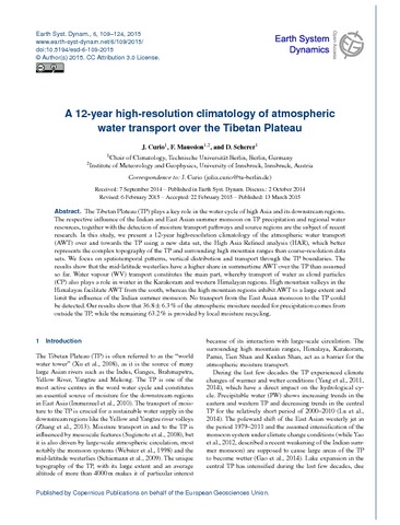 Curio, J., Maussion, F. and Scherer, D. (2015) A 12-year high-resolution climatology of atmospheric water transport over the Tibetan plateau. Earth System Dynamics, 6 (1). pp. 109-124. ISSN 2190-4987 doi: 10.5194/esd-6-109-2015