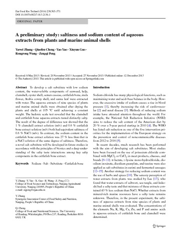 Zhang, Y., Cheng, Q. orcid id iconORCID: https://orcid.org/0000-0001-8198-8556, Yao, Y., Guo, X., Wang, R. and Peng, Z. (2014) A preliminary study: saltiness and sodium content of aqueous extracts from plants and marine animal shells. European Food Research and Technology, 238 (4). pp. 565-571. ISSN 1438-2377 doi: 10.1007/s00217-013-2136-1