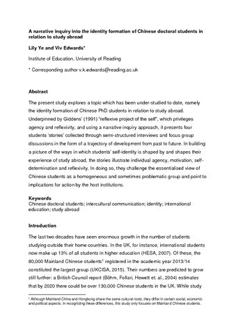 Ye, L. and Edwards, V. (2017) A narrative inquiry into the identity formation of Chinese doctoral students in relation to study abroad. Race, Ethnicity and Education, 20 (6). pp. 865-876. ISSN 1470-109X doi: 10.1080/13613324.2017.1294570