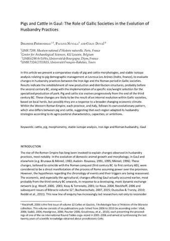 In this article we present a comparative study of pig and cattle morphologies, and stable isotope analysis relating to pig demographic management at Levroux Les Arènes (Indre, France), to evaluate changes in husbandry practices between the Iron Age and the Roman period in Gallic societies. Results indicate the establishment of new production and distribution structures, probably before the second century BC, along with the implementation of a specific size/weight selection for the specialized production of pork. Pig and cattle size evolves progressively from the end of the third century BC. These changes are likely to be the result of an internal evolution within Gallic societies, based on local herds, but possibly they are a response to a broader changing economic climate. Within the Western Roman Empire, each province, and Italy, follows its own evolutionary pattern, which also differs between pig and cattle, suggesting that each region adapted its husbandry strategies according to its agro-pastoral characteristics, capacities, or ambitions.
