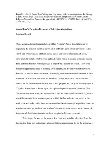 Bignell, J. orcid id iconORCID: https://orcid.org/0000-0003-4874-1601 (2018) James Bond’s forgotten beginnings: television adaptations. In: Strong, J. (ed.) James Bond Uncovered. Palgrave Studies in Adaptation and Visual Culture. Palgrave Macmillan, Basingstoke, pp. 41-60. ISBN 9783319761220 doi: 10.1007/978-3-319-76123-7_3