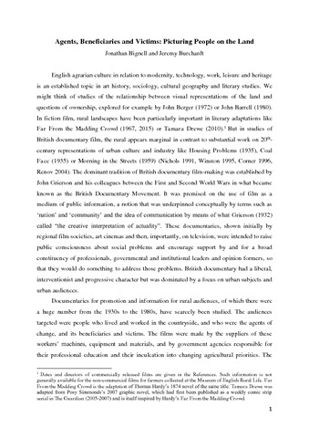 Bignell, J. orcid id iconORCID: https://orcid.org/0000-0003-4874-1601 and Burchardt, J. orcid id iconORCID: https://orcid.org/0000-0001-9483-1494 (2017) Agents, beneficiaries and victims: picturing people on the land. In: Haigron, D. (ed.) The English Countryside: Representations, Identities, Mutations. Palgrave Macmillan, Basingstoke, pp. 61-82. ISBN 9783319532721 doi: 10.1007/978-3-319-53273-8