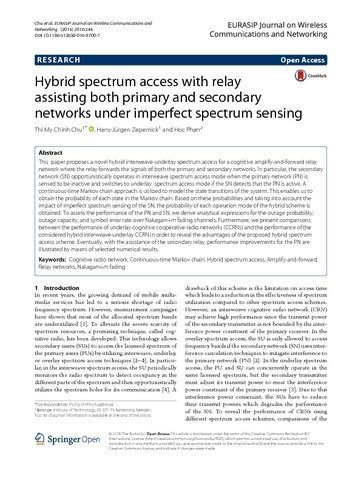 Chinh Chu, T. M., Zepernick, H.-J. and Phan, H. (2016) Hybrid spectrum access with relay assisting both primary and secondary networks under imperfect spectrum sensing. EURASIP Journal on Wireless Communications and Networking, 2016 (1). 244. ISSN 1687-1499 doi: 10.1186/s13638-016-0700-7