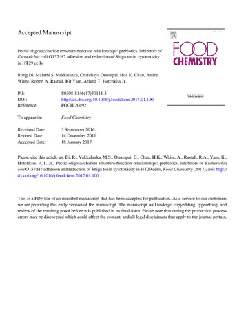 Di, R., Vakkalanka, M. S., Onumpai, C., Chau, H. K., White, A., Rastall, R. A., Yam, K. and Hotchkiss, A. T. (2017) Pectic oligosaccharide structure-function relationships: prebiotics, inhibitors of Escherichia coli O157:H7 adhesion and reduction of Shiga toxin cytotoxicity in HT29 cells. Food Chemistry, 227. pp. 245-254. ISSN 0308-8146 doi: 10.1016/j.foodchem.2017.01.100
