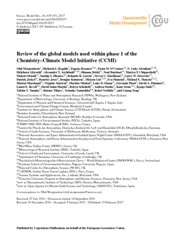 Morgenstern, O., Hegglin, M. orcid id iconORCID: https://orcid.org/0000-0003-2820-9044, Rozanov, E., O'Connor, F. M., Abraham, N.L., Akiyoshi, H., Archibald, A., Bekki, S., Butchart, N., Chipperfield, M. P., Deushi, M., Dhomse, S. S., Garcia, R. R., Hardiman, S. C., Horowitz, L. W., Jöckel, P., Josse, B., Kinnison, D., Lin, M., Mancini, E., Manyin, M. E., Marchand, M., Marécal, V., Michou, M., Oman, L. D., Pitari, G., Plummer, D. A., Revell, L. E., Saint-Martin, D., Schofield, R., Stenke, A., Stone, K., Sudo, K., Tanaka, T. Y., Tilmes, S., Yamashita, Y., Yoshida, K. and Zeng, G. (2017) Review of the global models used within phase 1 of the Chemistry-Climate Model Initiative (CCMI). Geoscientific Model Development, 10 (2). pp. 639-671. ISSN 1991-9603 doi: 10.5194/gmd-10-639-2017