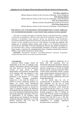 Perna, L. W., Orosz, K., & Jumakulov, Z., 2015. Understanding the human capital benefits of a government-funded international scholarship program: An exploration of Kazakhstan's Bolashak program. International Journal of Educational Development, 40, 85-97.