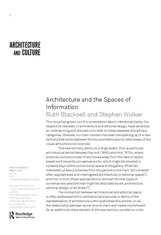 Blacksell, R. and Walker, S. (2016) Introduction: architecture and the spaces of information. Architecture and Culture, 4 (1). pp. 1-8. ISSN 2050-7836 doi: 10.1080/20507828.2016.1153241