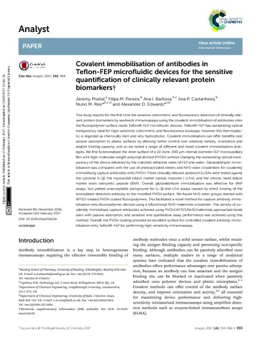 Covalent immobilisation of antibodies in Teflon-FEP microfluidic devices for sensitive quantification of clinically relevant protein biomarkers.