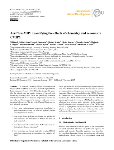 Collins, W. J. orcid id iconORCID: https://orcid.org/0000-0002-7419-0850, Lamarque, J.-F., Schulz, M., Boucher, O., Eyring, V., Hegglin, M. I. orcid id iconORCID: https://orcid.org/0000-0003-2820-9044, Maycock, A., Myhre, G., Prather, M., Shindell, D. and Smith, S. J. (2017) AerChemMIP: quantifying the effects of chemistry and aerosols in CMIP6. Geoscientific Model Development, 10 (2). pp. 585-607. ISSN 1991-9603 doi: 10.5194/gmd-10-585-2017