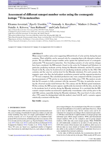 Asvestari, E., Usoskin, I. G., Kovaltsov, G. A., Owens, M. J. orcid id iconORCID: https://orcid.org/0000-0003-2061-2453, Krivova, N. A., Rubinetti, S. and Taricco, C. (2017) Assessment of different sunspot number series using the cosmogenic isotope 44 Ti in meteorites. Monthly Notices of the Royal Astronomical Society, 467 (2). pp. 1608-1613. ISSN 1365-2966 doi: 10.1093/mnras/stx190