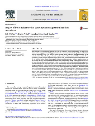 Tan, K. W., Graf, B. A., Mitra, S. R. and Stephen, I. D. (2017) Impact of fresh fruit smoothie consumption on apparent health of Asian faces. Evolution and Human Behavior, 38 (4). pp. 522-529. ISSN 1090-5138 doi: 10.1016/j.evolhumbehav.2017.02.004